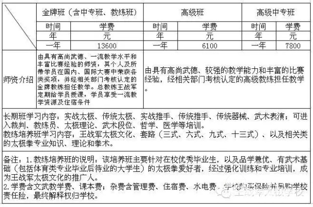王战军太极学校视频简介 王战军太极学校位于太极拳发源地河南温县陈家沟。由中国太极拳新一代领军人物,“王战军太极”品牌创始人、“常胜将军”王战军先生创办并担任校长和总教练。 学校占地面积30000平方米、配套设施完善、师资力量雄厚、全年招收6至20岁左右长期班学生以及各年龄段的短期班学员。在太极名家王战军先生的带领下,我们正朝着成为“中国太极拳职业教练员培训基地”的目标不断前进。 自1996年建校以来,王战军太极学校已经培养出数十名全国武术冠军,在央视“武林大会、武林风、峨眉传奇”等大型赛事中屡夺佳绩,荣获奖牌12180余枚,其中金牌4000多枚;多年来,学校努力培养热爱太极文化并希望将太极拳作为自己职业技能的学生。作为一所太极拳特色学校,我校还增设了文化课程,文武双全、德才兼备是我们的教学方针。 随着大健康产业的发展,太极拳职业教练员已成为当今一项热门职业,由王战军先生亲力打造的“教练培养班”也于2014年正式开班,旨在培养太极拳职业教练员。我们倡导:习拳者、徳为先;善武者、和为贵。希望将学生培养成德才兼备、拥有从业资格和技能的太极拳专业人才。同时,学校还与武汉体育大学开展联合办学,从而实现了我校教练培养班的毕业生可以同时拥有:国家承认的大专文凭、王战军太极职业教练员认证证书以及参加“王战军太极”这个平台遍布国内外十几个国家、八十多个发达城市的外派教练员培训机会,在理论与实践相结合的教学模式中,坐拥“中国太极拳职业教练员培训基地”—王战军太极学校独有的社会实践平台,为学生将来从校园走向社会搭建直通桥梁。成绩优秀者,还能获得“王战军太极”在全国及世界各地分会、养生会所或推广中心以及加盟合作企业的就业机会。只要你努力!就能成为我们“王战军太极”的推广人,就有机会参与分享我们的发展硕果!未来,我校“教练培养班”毕业生定将成为“大健康产业”中养生领域的“抢手人才”。 收费标准 长期班收费标准(全日制) 开设课程 文化课教学设置 我校的文化课教学分为三个学部:小学部﹑中学部与中专部。所设学科与国家教学大纲同步,并结合生源的实际情况开设特色学科,学生毕业后均颁发国家承认学历的毕业证书。 小学部:开设语文、数学、英语、品德、写字、社会等课程。以开发小学生天赋兴趣的为主,采用多种形式的教学方式相结合,寓教于乐,学生们在学好文化课的同时,接受中国传统太极文化的启蒙教育。 初中部:开设语文、数学、英语、品德、历史、地理等科目(物理、化学、生物等为选修科目),并增加特色学科:书法、写字等课程。以关注青春期孩子的心理健康成长为主,因材施教,学生们接受文武双修的学习理念,在勤习武艺的同时内修文化。 中专部:开设语文、数学、英语、政治等课程。在此基础上增设特色课程:太极拳理论、高考特训。以关注学生树立正确的人生观与价值观为主,注重学生的品德培养,为学生步入社会奠定良好的基础。 武术课教学设置 王战军先生把其二十余年来所积累总结习练太极和赛场夺冠的心得和经验与团队悉心教研,并结合吸取其他武学的特长,研磨出一套系统完善的武术教学大纲。武术专业课程设置为:武术基本功、太极拳套路(包括器械套路)、太极推手、实战太极。四门课均以我校的教学大纲(年级任务)指导教学。 名师出名校,学校一直致力于教练员的培养,由王战军先生和外聘的优秀太极拳老师定期为本校教练员授课,并制定了一套严格科学完善的教练员培养、考核、选拔制度。学校教练员分三个的等级:高级教练、金牌教练、特级教练。学校武术课分:高级班(由高级教练教学)、金牌班(由金牌教练教学)。 针对全日制在校学生开设如下课程: 小学部:以基本功为主,另设置套路、推手和实战课程。 初中部:以基本功和套路为重点教学,开设推手实战课程。 中专部:根据学生特点,开设国家规定和自选竞赛套路(含各种器械),兼学其他流派之精华(如杨氏、吴氏、武式、孙氏等)。以推手和实战为重点教学,在熟练掌握传统太极拳套路的基础上,把太极拳推手、太极拳散手中的招式、技巧巧妙运用到实战中去,实现传统太极拳与实战太极有机结合,相辅相成。学生获得国家二级运动员证,可为将来考入高等学府奠定良好基础。 全日制武术课程: (一)太极拳套路: 1、传统套路:主要学习太极拳传统套路及器械。 2、国家竞赛套路:主要学习国家规定的竞赛套路和自选套路。 (二)实战太极: 特色教学模块。主要学习实战太极基本技术、攻防实战技术和格斗对抗技术。 (三)太极推手: 主要学习太极推手的核心技术,把太极拳中的掤、捋、挤、按、採、挒、肘、靠与推手技术相融合,通过专业训练,方可达到“由著熟渐悟懂劲”的境界。 (四)健身养生班: 主要学习王战军太极系列拳法:王战军太极十三式﹑王战军太极三式﹑王战军太极六式﹑王战军太极九式等,以达到调节身体机能、修身养性、延年益寿的目的。 (五)短训班: 适应于太极拳业余爱好者、专业教练或在职工作人员的短期培训,以提高其专业水平和身体素质。根据需求,可选择学习太极拳传统套路和器械,也可选择学习其它对抗性专业项目。 (六)青少年寒暑假班: 以学习武术基本功和太极拳套路为主,兼学实战太极,是针