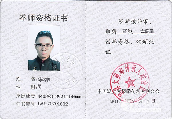 陈远帆,南拳陈家拳第四代传人,陈家沟陈氏太极拳第十三代传人,陈家沟陈氏太极拳协会广东清远分会会长,清远市太极拳文化研究会会长,清远市陈氏太极拳馆馆长,世界太极拳联谊会常务理事,中国首家太极门户网站太极网清远分站站长,清远市聚雨轩文化传播有限公司总经理,云南省普洱市昌福號古树茶园创始人。曾获中国太极拳精英赛太极拳套路一等奖、清远市第三届太极拳精英赛金奖。 陈远帆,1992年出生于粤西沿海地区,自小热爱中华传统文化,精通太极拳和茶道,4岁开始跟随父亲陈确博士习练南拳陈家拳、陈氏太极拳,在承袭世代家传武学的基础上,先后师从当代陈家沟陈氏太极拳掌门人陈小旺、梅花拳术大师韩建中,熟练掌握陈氏太极拳和现代擒拿格斗术。 自在清远传播陈氏太极拳以来,陈远帆对清远的太极拳事业做出很大的贡献,勤于教授太极拳和传播太极拳,全年无休,风雨不改!更在清远建立了第一个专业的陈式太极拳馆,组建了清远市陈氏太极拳大家庭,创立了太极拳文化研究会,多次举行了太极拳文化活动!在当地培养一批太极拳人才和引起了广大市民的关注!作为一个90后的年轻人,精于传教,脚踏实地,弘扬陈氏太极拳,推动正能量社会,推动健康中国建设作出积极的努力和贡献,正带领着一批又一批的太极拳爱好者走上了各自风采的太极人生! |