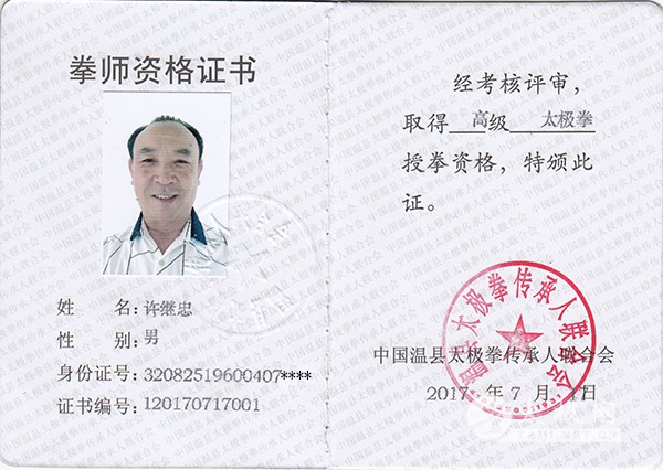 许继忠,生于1960年,江苏泗阳人,现住杭州,自幼学习少林拳,棍,2007年转入学杨式太极拳,坚持不懈,潜心学习太极理论及拳架已十年。