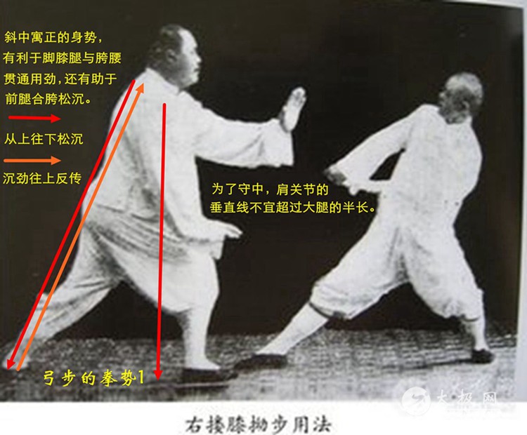 配文的图片,其中有两张分别是《弓步的拳势1》(图中用杨澄甫宗师的拳照来制作)、《弓步的拳势2》(图中用我恩师林墨根的拳照来制作)。从两张弓步拳势的示意图看出是上身较正的“左玉女穿梭”和上身较斜的“右搂膝拗步”,是练上身较正的弓步较好还练上身较斜的弓步较好?其实各有妙用。 有人查看没见前辈有“斜中寓正”的说法,今人说的“斜中寓正”是误导人,如果身体偏斜,重心就会不易稳定,果真如此吗?我们首先搞清楚怎样是“斜中寓正”?以《弓步的拳势1》为例,我对此理解为上身较斜的弓步姿势寓(寓的字义为寄托或暗含的意思)有“立身中正”的内涵和功夫。各人对“立身中正”的理解认识不同是正常的探理研拳,不妨以拳证道吧!我叫弟子们按《弓步的拳势1》的技术要求体验过,脚膝腿与胯腰斜向贯通用劲,为了守中,肩关节的垂直线不宜超过身前大腿的半长,这样的夹角有利于前实腿的松腰落胯,以推桩守桩的形式对练印证,觉得身体重心较为稳定、下盘较为稳固,合适用在诸如“搂膝拗步”那样情况的拍胸击打,唯一不足之处是不便于边沉边转的用法。上身较斜的弓步是发劲击打的动态拳势,身斜多少随发劲击打的实际情况而定。拳书讲解“右搂膝拗步”的用法是“如乙若用左手以直打来,甲可以用右手搂住乙的左膊,甲左手绕自膀尖处,伸指掌拍乙胸前。要掌心去劲,右足弓式左足蹬劲。”按照这样的招式,选用上身较斜的弓步就比较合适顺势发劲,推打的威力大一点,打得对方向后下失重的跌出去。 《弓步的拳势2》是上身较正的弓步,前腿松腰落胯、后腿松腰塌胯的松沉气力垂直于地,用意念引导两脚分别斜向撑住胯根,弓步有沉中有撑的技术要求。上身较正的弓步,有利于中定势的动态变化;用于拳式定势,收效较好。拳书讲解“左玉女穿梭”的用法是:“如对方向我上部来犯,我以右手臂上掤其来手,并以左手掌向其当胸击之。”按照这样的招式,选用上身较正的弓步就比较合适顺势发劲,推打的威力大一点,打得对方向上腾起失重的跌出去。只要符合技术要求和练法正确,上身较正的弓步和上身较斜的弓步都有“立身中正”的内涵,根据实际情况选用合适就好了。 对于太极拳初学者而言:把“立身中正”理解认识透了,对于什么时候上身正一点或上身斜一点就会心中有数了。何谓“立身中正”?我认为:“立身”是指走架打手之前要调整好身体姿势,重在处理协调好意形诸方面的矛盾冲突;“中正”重在内涵,指身体内部的对称、平衡、沉稳,非简单的形态之谓,目的是守住重心中线站稳。倘若立身不中正,那么劲力就不能顺达,圆转变化就不会轻灵。“中正”是一成不变的吗?我看不是,它要随着技法的需要而变化,随着守中功夫的变化而变动。在“望海远游”的新浪博客看到了一篇《杨澄甫宗师中晚年拳照对比》博文,该文说:“杨澄甫青年图片中只有上步七星有撅臀之嫌,我觉得可能是为出功夫,蹲身较低,身体前倾以维持重心所致。但仔细看,拳意很好,大有一抬手即将人放出之势。前倾、后坐均是太极拳应有之义。练时为了拉筋脉,一条线逼出内劲。打时为了争取空间、时间。前倾,则泰山压顶,后坐,则江中磐石。”我认为,太极拳在不同阶段有不同层次的追求和练法,辩证的看待屁股突出的问题是较为客观的。“立身须中正安舒”的练法是要正确协调形、气、劲、神之间的和谐统一,周身内外一家了自然会“安舒”,其目的是为“八面支撑”服务,也是为了静态拳势和动态拳势的时时中定。对于入门阶段而言:“立身中正”是凭啥立身而得中正?是凭虚领顶劲、松肩垂手或沉肩坠肘、含胸拔背、松腰塌胯或松腰落胯、尾闾下垂、气沉丹田、开胯圆裆、挺膝松踝、脚地相吸等而立身,是凭肩与胯合、肘与膝合、手与足合、尾闾下垂或翘前守中的调整手段而立身,是凭支撑八面、守住重心中线的功夫而立身。有些人把“立身中正”理解成“走架打手过程中始终保持身体正直”的看法,我认为是不切合走架打手的实际情况。 以上系本人初窥太极拳门径的一孔之见,认识肤浅,仅供太极拳初学者参考。意在抛砖引玉,愿与同道一起探讨太极拳真谛,为弘扬国粹尽一份力量。 责任编辑:太极网安安 |