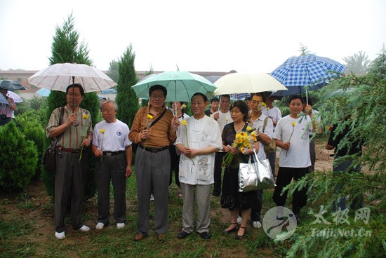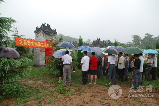 | 2009年8月17日上午,在陈家沟“中华太极拳文化园”的太极拳祖林内,太极拳大师陈立清纪念碑揭幕仪式隆重举行。淅淅沥沥的小雨让祖林显得更加肃穆庄重。 温县县委常委、办公室主任秦迎军,温县政协副主席郑爱珍,温县体育局、文化局、旅游局的相关负责人,以及陈家沟村委主任陈皂罗,和陈家沟家族理事会及部分村民代表参加了今天的揭碑仪式。参加揭碑仪式的还有陈立清的儿子原定宇、萃华武术馆馆长陈永福,以及陈立清的弟子、再传弟子等。温县政协副主席郑爱珍代表县委、县政府致辞,高度评价了陈立清大师对太极拳的弘扬和传播所作出的卓越贡献。陈家沟村委主任兼陈家沟太极拳推广中心执行主任陈皂罗和萃华武术馆馆长陈永福分别致辞。温县体育局局长宋明军主持揭碑仪式。 温县体育局、温县武术协会、温县文化局、温县旅游局、陈家沟村委、萃华武术馆以及太极网和中华太极拳传承谱系工程领导小组办公室分别向纪念碑敬献了花篮。参加揭碑仪式的人们手持鲜花在大师祭台前献花致敬,深切缅怀这位陈家沟的好儿女、太极拳优秀传承人。 陈立清先生是享誉世界的太极拳大师,她出生于太极拳发源地——河南省温县陈家沟,系陈氏十九世,陈氏太极拳第十一代传人,是西安萃华武术馆创始人,生前曾任中国(温县)国际太极拳年会副秘书长、顾问等。陈立清先生教书四十年,传拳六十载,爱国穷其生,弟子遍布世界各地,桃李满天下,是实至名归的太极拳大师。在祖林立碑,是她弟子们的愿望,经陈立清大师家人及萃华武术馆的申请,温县县委、县政府鉴于陈立清大师一生为太极拳事业所做的杰出贡献,特批准许在太极拳祖林建立“陈立清大师纪念碑”。 陈立清先生的家人、弟子及再传弟子等最后在大师纪念碑前合影留念。