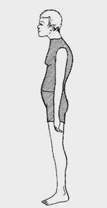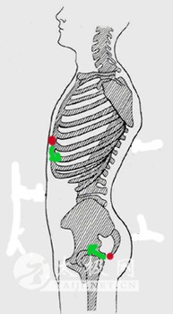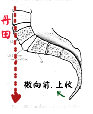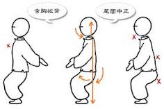 在医学上(图) 当您用力挺胸时,胸骨尾端的剑骨突(红点部位)会往外凸出。因此想做含胸这个动作,必须将剑骨凸很轻,很柔地微微往内下收,但也须注意不可收得过分,胸肌与肋间肌放松,脊背自然地舒展放松。能含胸就自然地能拔背。拔背就是放松背部的肌肉,拔掉背部的力量。但是,如果剑骨突收得太过分,就如下图,不是含胸拔背而是弯腰驼背。 我们再来谈谈“尾闾中正”,什么时尾闾呢?尾闾就是解剖学上的尾椎骨,尾闾中正在医学上就整条脊椎骨的中心线要自然放松的与地面垂直。 成年人的脊椎骨从侧面看是呈拉长的s形弯曲,在腰部的地方向前弯曲,但人类的脊柱骨在婴儿时期是平直的,等到开始直立走路,为了脊柱的弹性缓冲震动碰撞的压力以保护脑部,脊柱骨开始呈s形弯曲。除此之外,人类的内脏器官皆位于脊柱前方,有在腰弯处呈s形前凸,也有助于直立身体的重心稳定。人体的重心点丹田也就是为于此腰弯前凸的前下方呢! 尾闾是尾椎骨部分,是位于脊椎骨的最末端,此处有一个生理弯曲,向内向上包挺住生殖、泌尿及大肠系统的器官。也因有此弯曲,弯曲之背部就是两侧臀部的中线,正常情况是微微往后翘起。