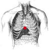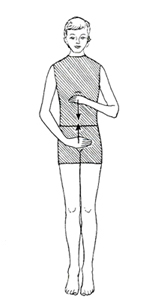 那么,含胸拔背,尾闾中正要怎么作,教您一个最简单的方法:请您立正挺胸,一手放在胃部上方,另一手放在丹田(小腹),两手轻轻地同时往肚脐的方向挤压,胸部及骨盘(臀部)自然柔顺地跟着挤压方向走,您就可体会一下,含胸拔背,尾闾正中。