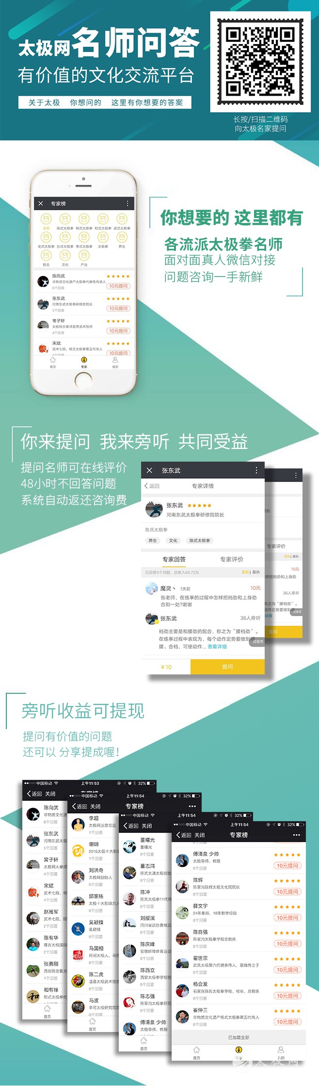 太极网名师问答平台开通啦! 首创太极拳知识问答价值分享模式! 为广大拳友与名师名家搭建 有价值的交流互动平台。 提问方式: 1、关注“太极拳”微信公众号,从底部菜单进入