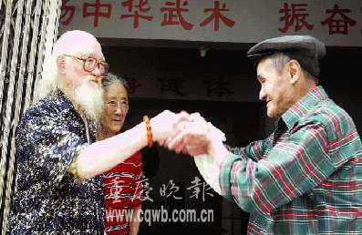 一位是誉为“长江大侠”的武当宗师,一位是曾师承少林的民间侠客。两位百岁武侠,相识七十余年,昨日,二位大侠在南岸区上新街紫剑武馆重逢。两位大侠有过共同的经历,是当今真正的武林高手。 期盼55年的相见 清晨。阳光。紫剑武馆。 一辆黑色轿车徐徐开来,停在武馆门前,身穿绿色军裤的老者走下车,他是李文治,今年105岁高寿了,已白了多年的银丝却又开始变黑,军裤烫得非常平整,可见当年英姿。拐杖随着身体颤抖,老者激动。 “老哥哥——”李文治紧紧握住另一老者双手。 他就是人称“长江大侠”的吕紫剑——紫剑武馆的主人,已经在此等候多时。 “我们民国十八年认识的(即1929年,记者注),1949年都去了新疆喀什,分别至今,没想到还能见到你……”李文治声音有些颤抖,两双手紧握着不想放,“55年了……” “那时候重庆又叫九门提督,重庆大轰炸的时候我就在临江门指挥炮台,击落了很多架日本人的飞机。”李文治说道,右手举过头顶划了一条弧线,然后手掌重重地拍在桌上,自豪之情溢于言表。 吕紫剑颔首,微笑地看着老友,“我那时候是国民党的空袭大队长,组织重庆市民的疏散。当然,也有好多事情都不堪回首。”随即吕紫剑撩起长长的白发,“后脑勺这个大大的刀伤就是日本鬼子砍的……” “北伐战争的时候被鬼子抓起来,要不是一身轻功,恐怕早就见不到老哥哥了!” “现在人老了,前几年我的轻功都不错,三层楼没得问题。”吕紫剑一听到轻功便来了劲,“就这样轻轻一点……”说着便用手比划起来。 “那时候孔家小姐就住在歇台子,不服管,冯玉祥亲自当保长治他们,关了一天一夜,哈哈哈哈……”回想起开心的往事,吕紫剑爽声大笑。 北伐战争、大轰炸、八年抗战、四大家族……这些只能在历史书上见的词语,在他们的口中如常人拉家常一样随口而出。 握手比试内力 长枪、大刀、三节棍、锏、锤……正对武馆大门的一面墙上,各种练武家伙应有尽有。 吕紫剑说,他已111岁了。他禁不住拿起双节棍武起来,周围的人迅速让出一块空地。只听得阵阵“呼呼”风声,众人瞠目结舌。 李文治也不示弱,甩掉拐杖就练起来,提腿、转腰、双手环绕…… “厉害!是什么功夫?”人群中有人问道。 吕紫剑说,自己学的是武当派工夫。李文治则称,年幼时曾拜师少林高僧清正大师门下,这套工夫让他几次从敌人手里死里逃生。 临走前,李文治又一声“老哥哥——”两老双手再次紧紧相握,只见两者手背青筋突起,李文治额头有些汗,但仍然不愿松手。 “是不是像武侠小说上写的那种比试内力?”记者忍不住问道。 “武功只是为强身健体,不为争高下。”吕紫剑如是说。 来源:重庆晚报 |