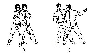 1.乙突然从背后抱住甲;甲方应迅速向下蹲,以防被对方抱起。(图8) 2.随即甲身体重心向后移,左臂向前伸,同时,右臂屈肘,以肘尖向乙方的胸部猛顶,解脱乙方抱腰,击伤对方。(图9)