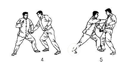 1.乙用右拳击打甲方的腰部;甲方迅速用左手向下,向左将其右拳格开。(图4) 2.随即甲迅速用右掌向前猛击乙右胸部。(图5)