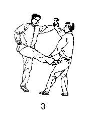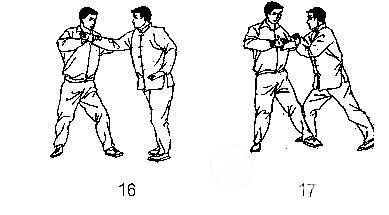 3.挤势 (1)乙右手抓甲右腕向后引甲;甲顺乙之捋势,右脚向前上一步,同时,左手向自己的右臂方向移动。(图16、17)
