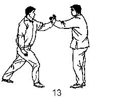 2.捋势 (1)乙上右步用左掌推击甲;甲立即举起左手格其左腕部。(图13)