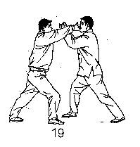 (2)随即甲身体重心略向后移;同时,用双手由上向下、向后弧形将乙双臂下引,使乙被引进落空(图20),而后甲用双手立即向前快速将乙挤出。(图21)