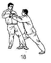 (2)随即甲身体重心前移,屈右腿,蹬左腿,成右弓步;同时,左手手掌附于右腕内侧,以右小臂平挤乙的胸部,将乙挤出。(图18)