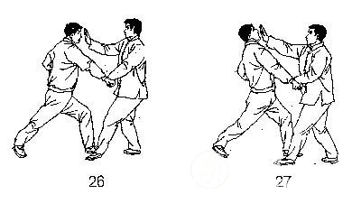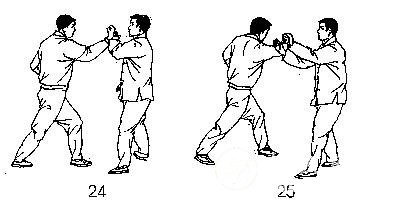 1.乙方用右拳向上击打甲方的下颌;甲应立即用左手向上、向左弧形格开。(图24)
