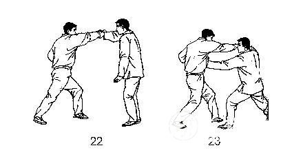 1.乙上左步用右拳击打甲方;甲立即用右手向上、向后弧形钩其右腕。(图22) 2.随即甲左腿屈膝半蹲,右腿伸直,成左弓步;同时,右手钩住其右腕向后带拉;左手成立掌猛力向其胸击出。(图23)