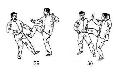 2.随即甲双手左右分开,化解乙方来拳,并迅速屈膝提起右腿,猛力向乙方的腹部蹬出。(图29、30)