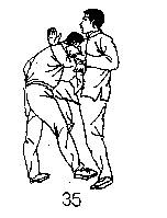 乙用右拳击打甲方;甲迅速用左手抓住其右腕关节并向后拉,同时右手(屈肘)由其右腋下向上挑起,使其身体前倾,同时,右腿屈膝向上猛提,用右膝猛顶其胸、肋部。(图35)
