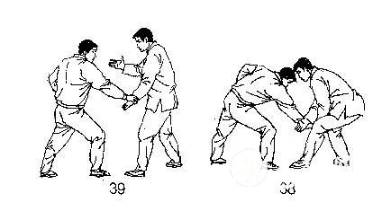 乙用右手抓住甲方的左腕关节(图38);甲立即用右手下切其右腕部,同时,身体重心下坐,双手借腰、腿之劲向下猛踩,可使乙向前倾倒。(图39)