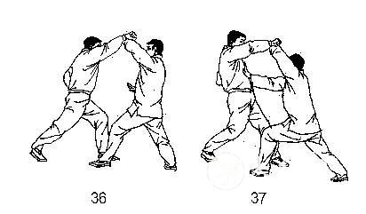 乙上左步用右拳击打甲方;甲立即举起左臂屈肘上架,同时,左腿屈膝半蹲,伸直右腿,成左弓步,用右掌向其胸、腹部猛击。(图36、37)