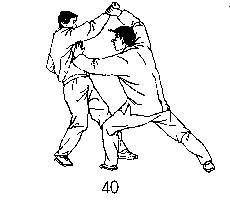 乙用右手扇甲的右耳;甲立即举起右手向上防开,同时,左腿屈膝半蹲,蹬右腿,成左弓步,用左掌向前击打乙的腰、肋部。(图40)
