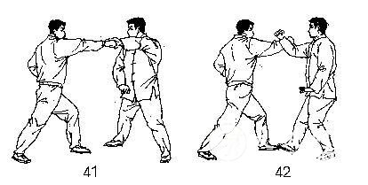 1.乙上左步用右拳击打甲;甲做“搬”的动作,身体向右转,右脚向前一步,同时,右手握拳肘微屈并向上、向右外拨。(图41、42)