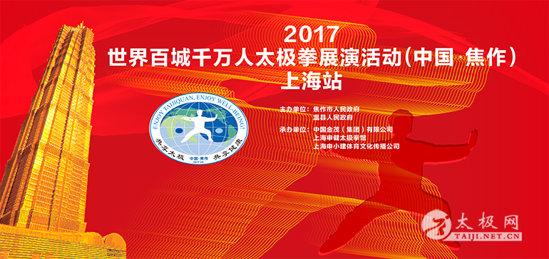 9月10日在上海地标金茂大厦举的"2017世界百城千万人打太极(中国·焦作)上海站展演"活动,由上海申健太极负责人、优秀青年拳师申小健及其团队领衔策划组织,自活动公告后,迅速受到广大太极拳爱好者积极响应和参与,截止目前报名人数已达上限! 因场地有限,上海申健太极团队在此抱歉地通知各位拳友,不再接受活动报名。申健太极代表活动组委会感谢大家支持,希望今后再有机会一起合作参与太极拳相关活动! 2017年世界百城千万人太极拳(中国·焦作)上海站展演活动”是中国·焦作市国际太极拳交流大会的重要载体活动,是中国一带一路中华文化复兴的展演活动,旨在向全世界集中展示中华传统武术精粹—太极拳的独特魅力,通过本次活动为申请太极拳成为世界非物质文化遗产添砖加瓦!中国金茂(集团)有限公司给予2017上海站太极展演活动的大力支持! 活动计划于9月10日9:30-10:30将在上海市著名地标420.5米高的金茂大厦举办,当天参练参演人员200人,按不同区域及武术俱乐部划分,统一身着白色太极练功服,在《在春江花月夜》背景音乐中演练陈式太极拳老架一路部分动作及各式太极拳,以展示上海太极拳爱好者的风采!期间将拍摄纪录片,为太极拳申遗做贡献! 上海申健太极 2017年8月29日 |