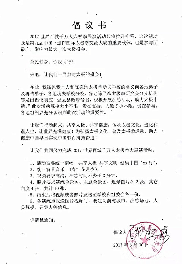 2017世界百城千万人太极拳展演活动 (中国·焦作)工作方案 一、活动名称 2017世界百城千万人太极拳展演活动(中国·焦作) 二、活动主题 共享太极 共享健康 三、宣传口号(第一条横幅必做,其余根据实际情况而定) 四、主会标 五、主会场喷绘背景(举办仪式时需要背景) 六、服装、演练动作及背景音乐 各演练点参演人员均身着太极拳练功服,统一演练太极拳套路。根据实际情况,可选《春江花月夜》等为背景音乐。演练活动正式开始前,拳师可引领全体参演人员高呼口号“共享太极、共享文明、健康中国(XX)行”“同根同宗太极魂、共兴共圆中国梦”。 七、图片、视频收集要求 1.视频拍摄要求。拍摄设备:高清摄像机;存储格式:存储为MPEG、MP4、MOV格式,分辨率不低于1280*720,码率不得低于8M/秒,视频时间不少于3分钟。 2.照片拍照要求。演练全景图、主题全景图、近景图片各2张,其它角度4张,共计10张;图片大小不小于3MB,格式为jpg、Bmp、Png。 3.收集人:白浩南 15893093233 崔 鹏 13569161962 4.收集邮箱:bcqwyl@126.com 5.各演练点报送图片视频时,要注明演练城市、演练场地、人员规模、召集人等信息。 |