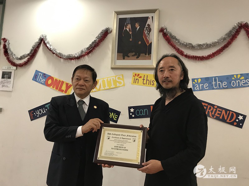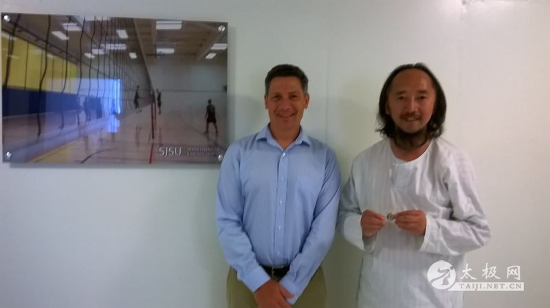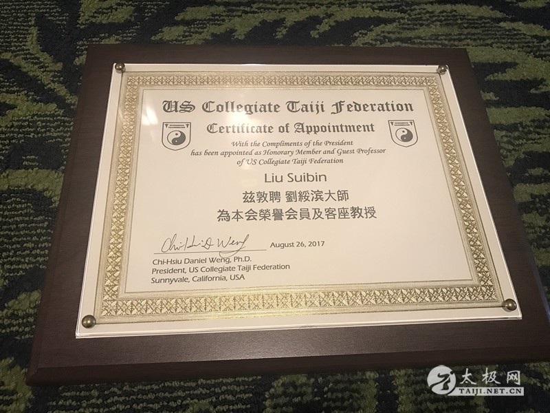 高校太极联盟向刘绥滨赠旗 经美国高校太极联盟研究决定,聘请刘绥滨为联盟荣誉会员及客座教授,由联盟会长翁启修教授(美国国际医药大学太极学院院长)亲自颁证,确定中、美、韩三国学者共同研究青城太极的养生康复功用,并将研究结果用英文成书,争取作为美国高校太极联盟教材,在美国出版发行,并将青城太极推向美国高校。其间在翁启修教授带领下,参访圣荷西州立大学,与该校运动系交流,系主任Matthew A.Masucci博士向刘绥滨赠送了系徽,刘绥滨向学生们介紹了青城太极在肩周炎的预防缓解技法。