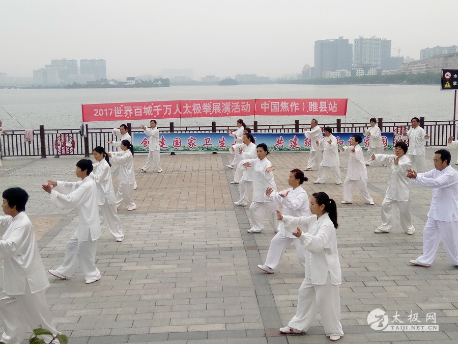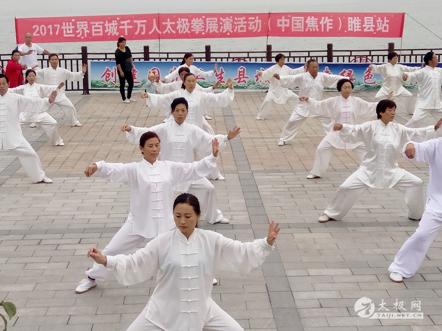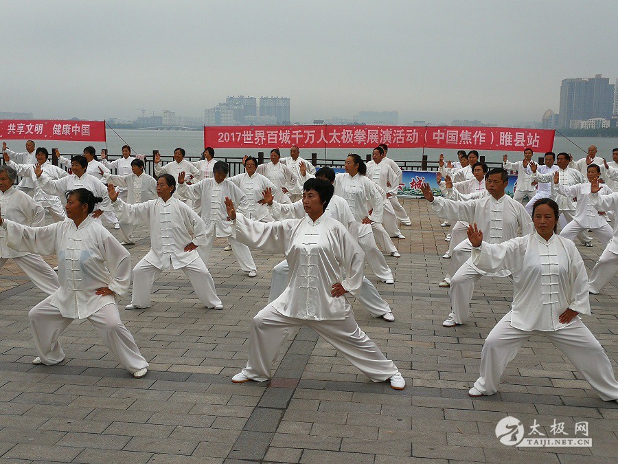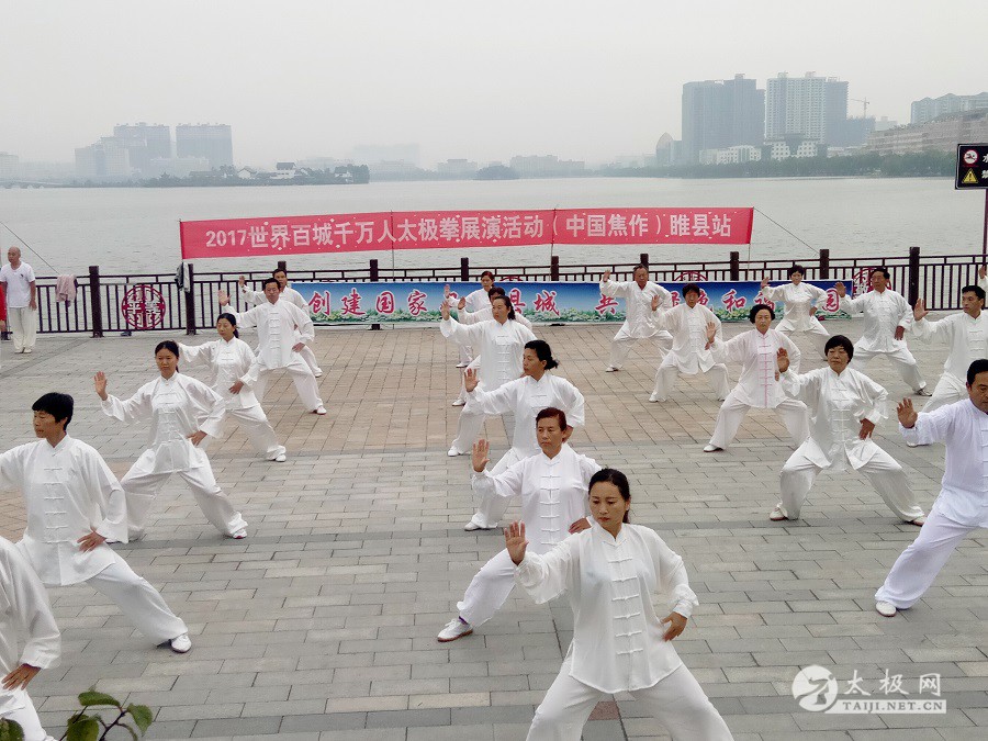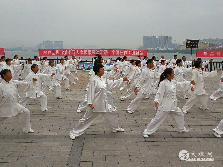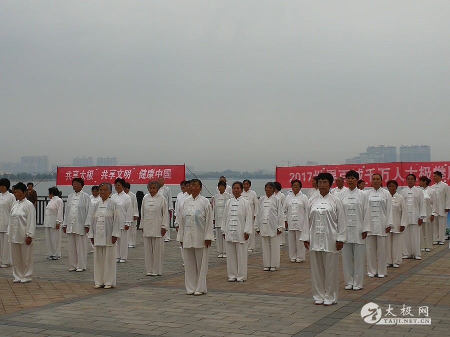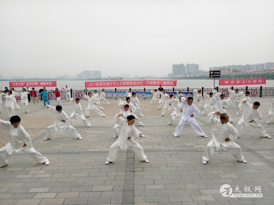 (太极网报道)9月3日,2017百城千万人太极拳展演活动(中国·焦作)睢县站成功举行,活动由睢县太极拳协会会长朱殿起、名誉会长褚亚龙等发起,在睢县太极拳协会的积极组织下,活动得到了县领导以及当地电视台的大力支持,80名太极拳爱好者汇集睢县北湖南码头,统一身着白色太极服在朱殿起会长的带领下同练太极。共享太极、共享健康! 以下是活动盛况集锦,更多精彩视频请关注太极网后续报道。 |