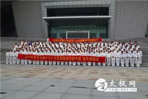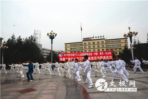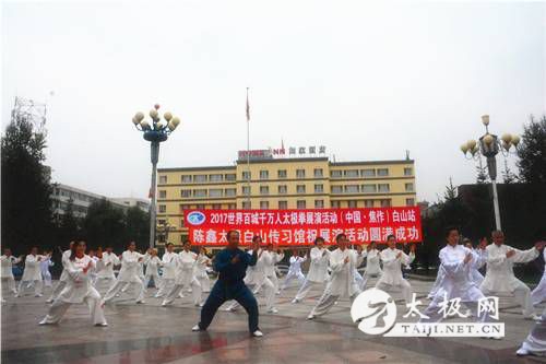 陈鑫太极拳吉林白山传习馆积极响应“共享太极,共享健康”2017年世界百城千万人太极拳展演活动,于9月9日9时在巍峨壮观的长白山脚下、美丽富饶的鸭绿江泮的如家广场上顺利完成了陈鑫太极拳的展演活动。 展演现场,50多名太极拳爱好者身着统一太极服,在春江花月夜音乐的伴随下,用刚柔相济,行云流水的太极拳拳姿,展示着东方文化的韵味和独特魅力! 这次的展演活动极大的调动了学员们的习练热情,在此特别感谢陈家沟陈氏太极拳传人陈沛林老师和陈沛菊老师的教导和鼓励,为弘扬陈鑫太极拳做出新贡献!