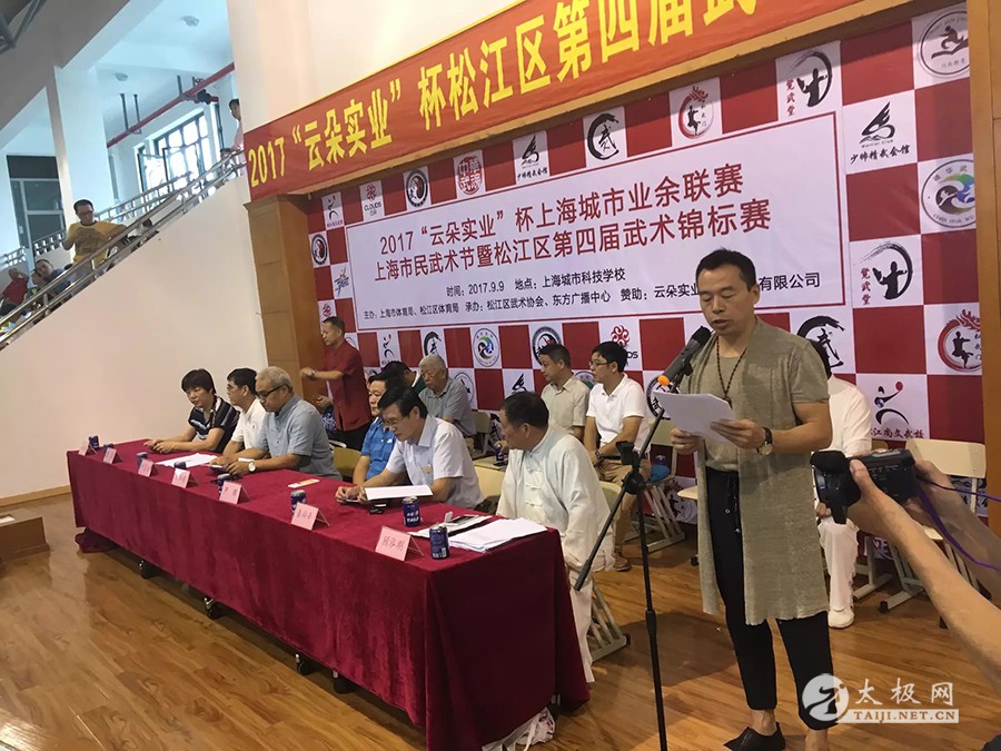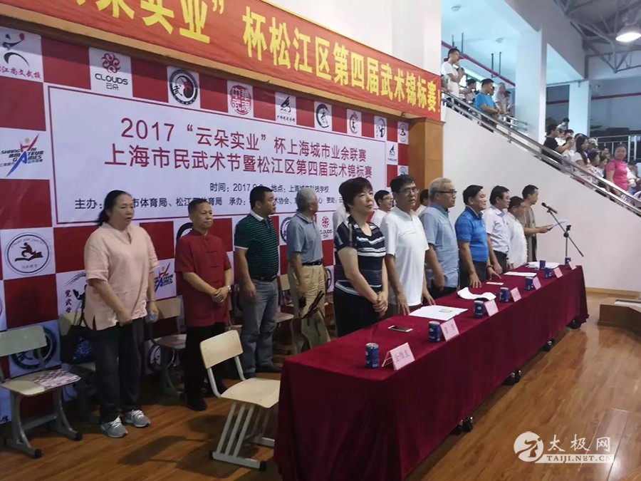 2017年9月9日,在松江体育局领导的关怀下,在比赛组委会的共同努力和筹备下,“云朵实业杯”上海市市民武术节暨松江区第四届武术锦标赛在上海市松江区隆重举行。是日天朗气清,惠风和畅,众多武术爱好者们欢聚一堂,共襄盛举,在松江区掀起一股勃勃生起的武林风。 参与此次盛会的有:上海武术运动管理中心主任、上海武术院院长严辉先生,上海武术运动管理中心主任、上海武术院副院长翟慧女士,松江区体育局局长孔林德先生,原上海体育学院武术系主任、现民族传统体育理论研究中心主任邱丕相先生,松江区体育局副局长秦梓辛先生,中国武术在线金惟良先生,松江区武术协会会长顾泓刚先生,天马论道董事长王雪先生,上海武术院业务科科长梅文源先生,松江区文化馆馆长陆春彪先生,上海市社区体育协会会长张祥泰先生,中国武术七段、杨氏太极第五代传人、斌惠杨氏太极俱乐部总教练宋斌先生,金山区荣欣书院董事长、杨氏太极第六代传人胡海荣先生以及松江武术协会全体领导成员等。 与会嘉宾 开幕式上,更是有各路名家纷纷登场献艺表演,展现各自风采。 松江区武术协会顾泓刚会长带来的终南形意龙形拳,川岳武馆带来的终南形意马形拳,为我们展示了三大内家拳之一形意拳的风采。 由岳阳街道岳之健团队带来了健身气功——气舞,展现了健身气功独特的文化底蕴。