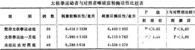 此外,早在上世纪八十年代,广州中医学院脾胃研究组就从唾液淀粉酶活性观测了太极拳运动的健脾作用。其测定对象分三组:一组是坚持太极拳运动一年以上者30例;一组是从事太极拳运动仅一个月者15例;另一组是准备参加太极拳运动而未经锻炼者40例……结果见下图: