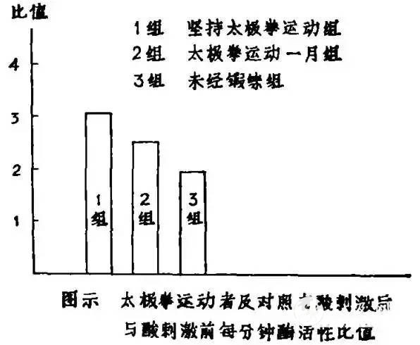 专家根据图示研究得出,坚持太极拳锻炼的比值>参加锻炼一月组>未经锻炼对照组。此比值大小顺序适与每毫升酶活性大小相一致,说明太极拳运动既能提高每毫升唾液淀粉酶活性,又能提高每分钟唾液淀粉酶活性,由此提示坚持太极拳运动对脾胃康复具有良好的效果。