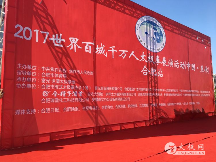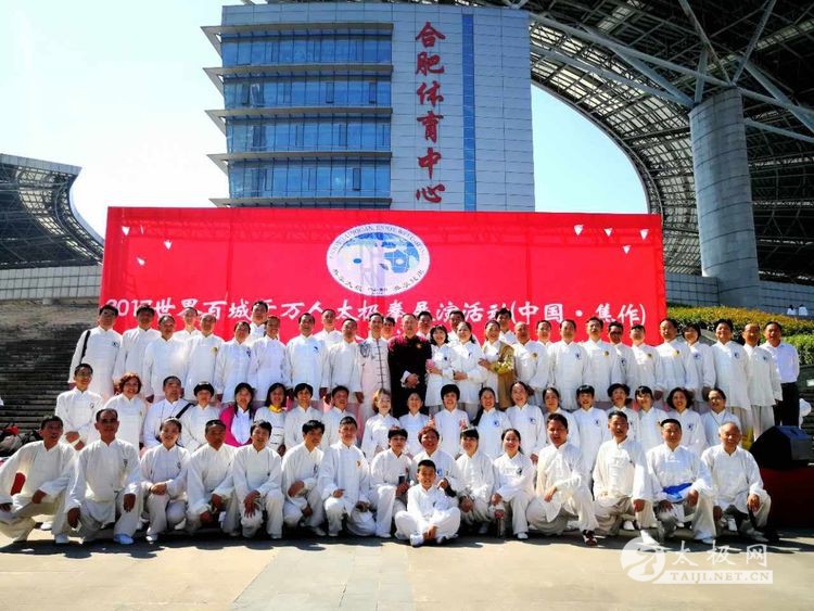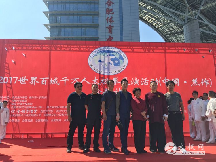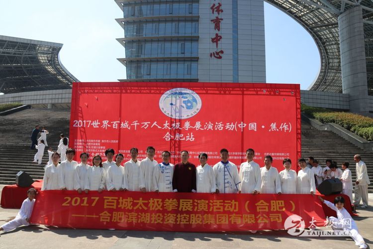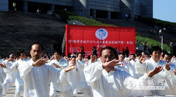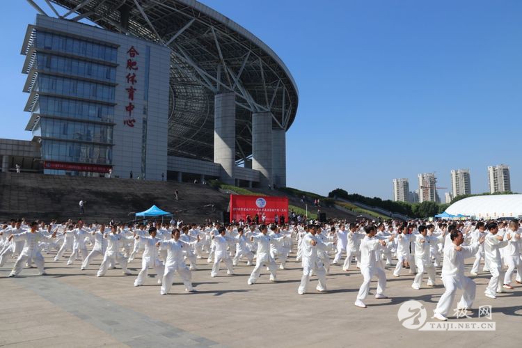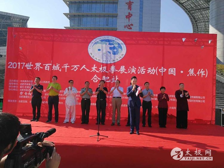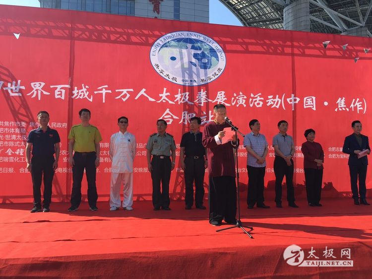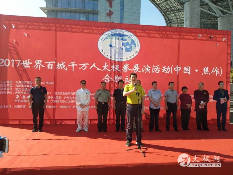 9月14日上午,2017世界百城千万人太极拳展演(中国焦作)合肥站活动启动仪式在合肥奥体中心举行。活动由河南焦作市人民政府主办,合肥市体育局指导,富光世清太极拳馆承办。拳馆组织了近千名太极拳爱好者参加了此次活动。 出席活动领导有原合肥市政协主席董昭礼、合肥市市委常委、合肥警备区政委姜宗健、合肥市人大常委会副主任宋家伟、李兵,合肥市政协副主席王贤泰、合肥市体育局局长菅青,温县人大常委会副主任原玉芹、合肥市民革主任委员谢海涛、安徽省武术协会社会部部长张祚川、富光世清太极拳馆馆长倪世清。 合肥市体育局局长致辞 富光世清太极馆长倪世清宣读口号 合肥市领导宣布活动正式启动后,在富光世清太极拳馆馆长倪世清老师倡议呼号“共享太极、共享健康”下,千人太极展演拉开帷幕,伴随着《春江花月夜》的悠扬音乐中演练陈式太极拳老架一路部分动作,展示百年太极拳的风采。