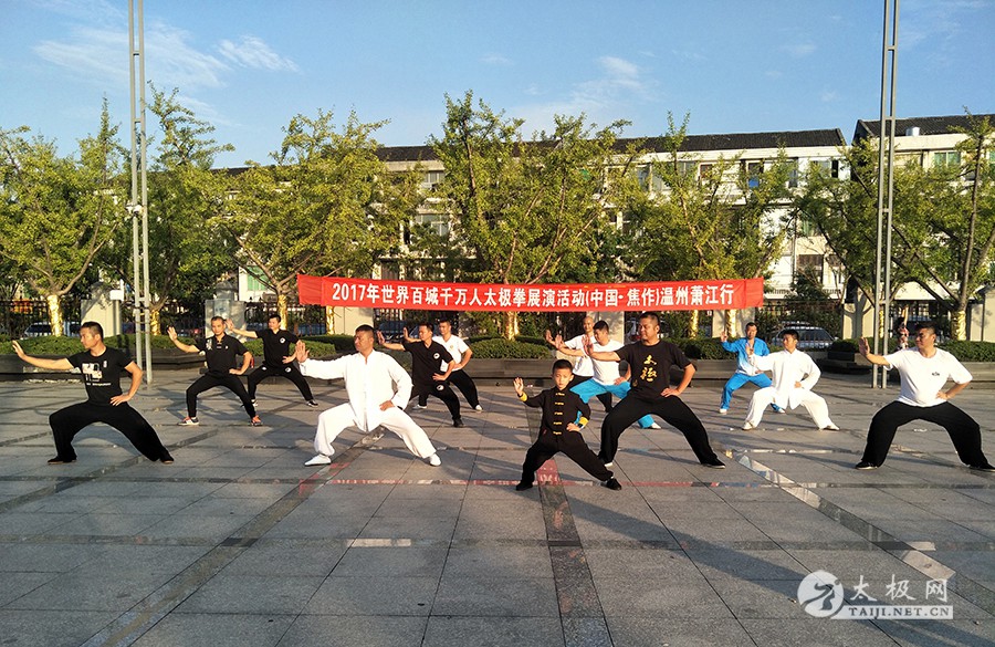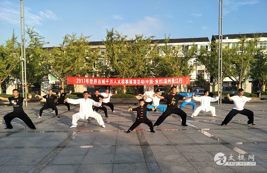 百城千万人太极拳展演活动萧江站 (太极网报道)2017世界百城千万人太极拳展演活动自9月1日于太极拳发源地陈家沟拉开序幕,持续近一周时间,热浪席卷全球,千万太极拳爱好者共享太极盛事。9月17日,徐象靠、林元横、陈维登组织萧江陈照森太极拳研究会全体成员于平阳萧江和苍南灵溪镇体育场,积极响应2017百城千万人太极拳展演活动。大家认真演练太极拳,真正诠释着这次活动的意义,感悟太极、共享太极,共享健康! 百城千万人太极拳展演活动萧江站 |