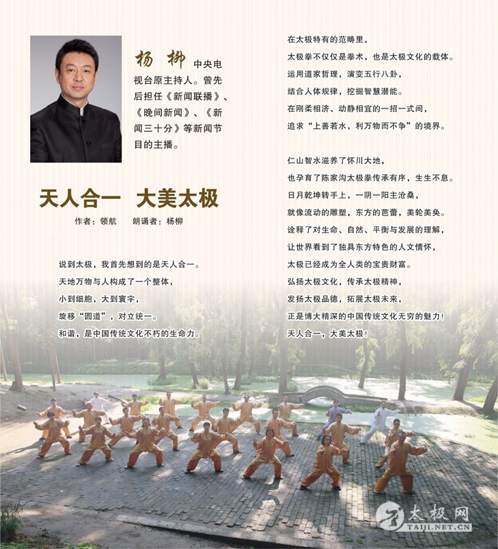 杨柳朗诵:《天人合一 大美太极》1989年,从事《新闻联播》栏目的播音工作。1997年,调入中央电视台文艺节目中心国际部环球组工作,担任《环球》节目主持人及编导。2000年,在中央电视台《春节歌舞晚会》中担任节目主持人。2002年,担任中央电视台西部频道《西部新闻》节目主持人。2003年,在中央电视台西部频道《魅力西部--春节大联欢》中担任节目主持人。 2004年,加盟中央电视台音乐频道,担任《音乐传奇》节目主持人。 2005年,参加"2006新年新诗会"。 2013年,亮相中央电视台春节联欢晚会。2015年7月24日,杨柳宣布从央视离职。 责任编辑:太极网陈超 |