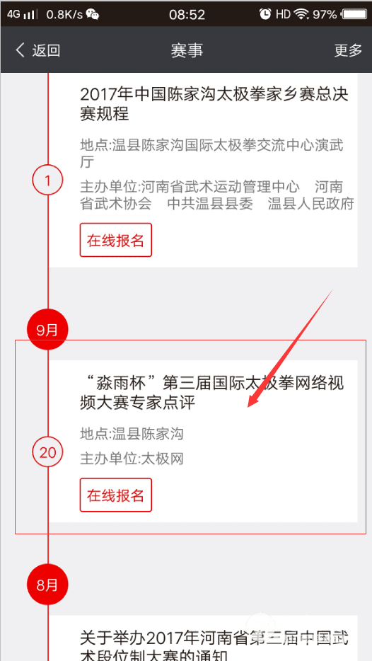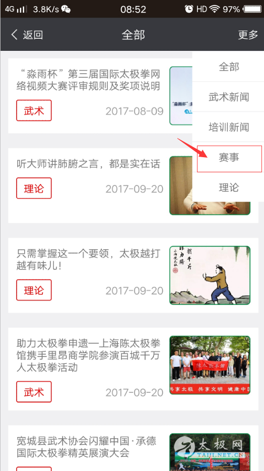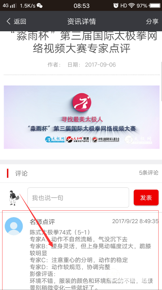 点击查看专家评语 四、如何再次查询专家评语 打开太极拳APP点击首页资讯模块 点击右上角更多,弹出下拉菜单后点击赛事模块 找到图中红色区域点击进入专家评语专区 收看个人专家评语 责任编辑:太极网陈超 |