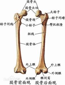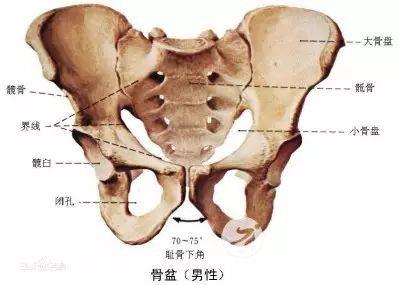 骨盆从正面看大体上是一个上宽下窄的梯形,从侧面看,骨盆略向前倾,女性骨盆的倾斜度大于男性。丹田大抵处于骶骨前面两个髋骨尖相连的位置。 骨盆两侧的中部的髋臼凹进去的地方连接着大腿骨的股骨头。髋臼像是一个轴碗,股骨头的前部呈半圆形,嵌在这个轴碗里,股骨头和髋臼也是由强韧的韧带和筋腱连接在一起。