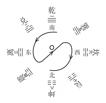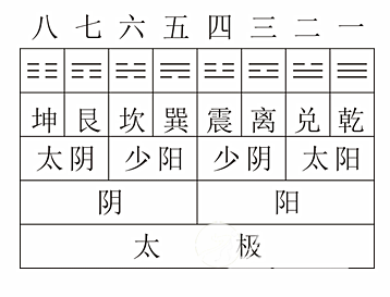 2)八卦排序依据先天八卦次序图与方位图排卦序,由太极图定阴阳大小,即不采用正负数概念,只依阴阳论大小。