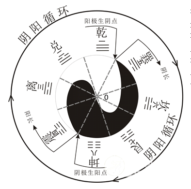 注:该图是对地球自转的摹拟,当地球受太阳照射时,直射点正面设定为阳为乾,该点背面设定为阴为坤。虽说直射点接受的太阳能量固定不变,但对自转地球的某点来说,就有一轮进入与退出直射点的过程,这就产生了阴阳同步变化,就某一点来说,绕行一周就是一次阴阳循环。
