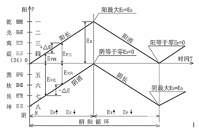 5)参量EP一阳能量,EN一阴能量、E0一交合能量,△E一消长变量,在卦:阴阳两侧皆△E=,在易:爻位有“趣时”之说,就是△E可随时随机应变,而产能耗能总是相等。