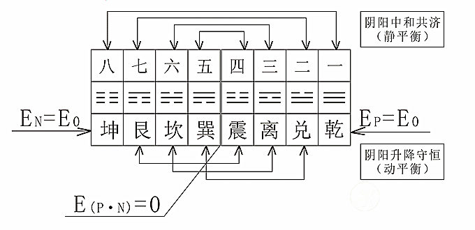 可见由定律表达的先天八卦,其阴阳升降无论阳长阴消或阳消阴长,其中对应两卦皆具有阴阳大小对称的特性。而在阴阳升降过程中,又皆具有产能与耗能相等的特性,即阴阳能量守恒。