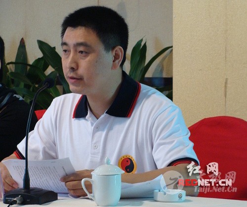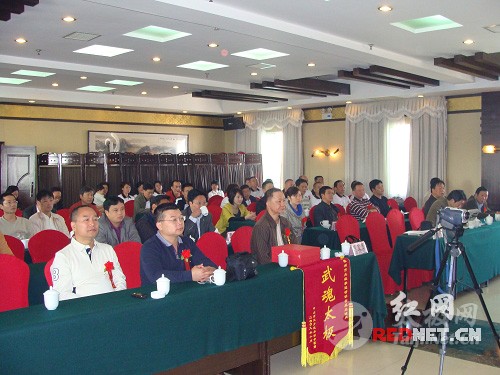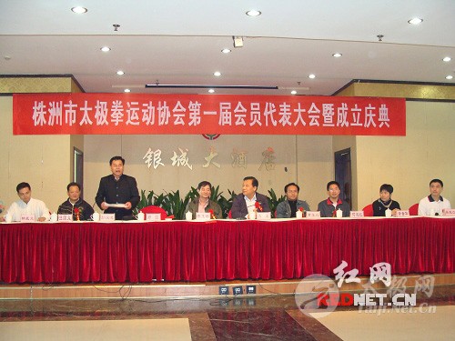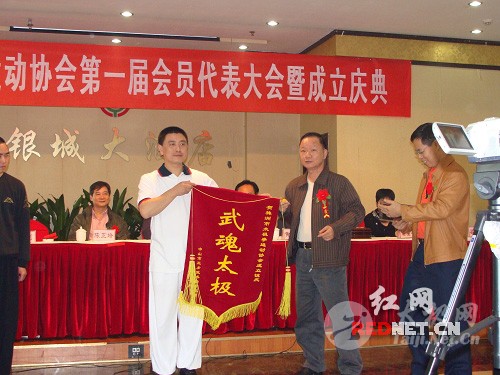 (11月7日,株洲市太极拳运动协会宣告成立。青琪 摄)  (来自加拿大温哥华市、澳大利亚墨尔本市、澳门和广东省中山市的武术团体代表向协会赠送纪念牌和锦旗。青琪 摄)  (吴政江任株洲市太极拳运动协会首任会长。青琪 摄)