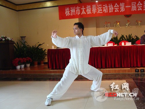 (参加株洲市太极拳运动协会成立庆典的会员代表和嘉宾。青琪 摄)  (太极拳表演。青琪 摄) 红网株洲11月7日讯(通讯员 青琪 柳战文)2008年的北京奥运会,让全民健身的热情空前高涨,今年的8月8日更被设定为首个“全民健身日”。经过一年多时间的酝酿和筹备,11月7日上午,湖南省株洲市群众体育运动重要组成部分的株洲市太极拳运动协会宣布成立,吴政江任首任会长。 作为中华民族独有的体育运动,太极拳从创立至今已经传承了几百年,并深受人们的喜爱。特别是改革开放以来,太极拳在株洲市得到了较好的普及与发展,据不完全统计,目前株洲市太极拳练习者已达万人之众。 “成立株洲太极拳运动协会既是太极拳运动发展的大势所趋,更是株洲这些太极拳爱好者的热切期盼。”吴政江介绍说,株洲市太极拳运动协会由关心、支持、热爱太极拳运动和武术健身活动的各界人士,以及各高等院校、企事业单位自愿组成,“它的成立,是我市太极拳事业和武术事业发展过程中的一个重要举措,对整合我市太极拳资源,传承太极拳文化,推动太极拳事业不断发展,具有重要意义。”