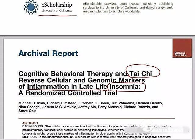 《生物精神病学》之论文原文 2015年11月由美国顶尖科研机构加州大学学者团队发表在《生物精神病学》杂志(BiologicalPsychiatry)上的随即对照研究显示:睡眠不足与炎症增加相关,而后者可能会导致心脏病和其他多种疾病。认知行为疗法和中国的锻炼技法太极拳(taichi)可同时减少失眠和炎症。
