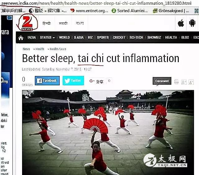 2015年11月7日来自印度著名门户 网站Zee的文章,太极减少炎症而改善睡眠。