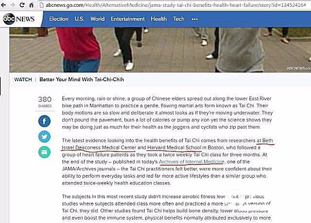 发表于世界著名医学期刊《内科学文献》的来自贝斯.以色列迪肯尼斯医学中心(哈佛医学院教学医院之一)和哈佛医学共同发表的研究显示:太极有利于心脏健康。这项研究的内容被刊登于2011年美国的顶级媒体ABC。