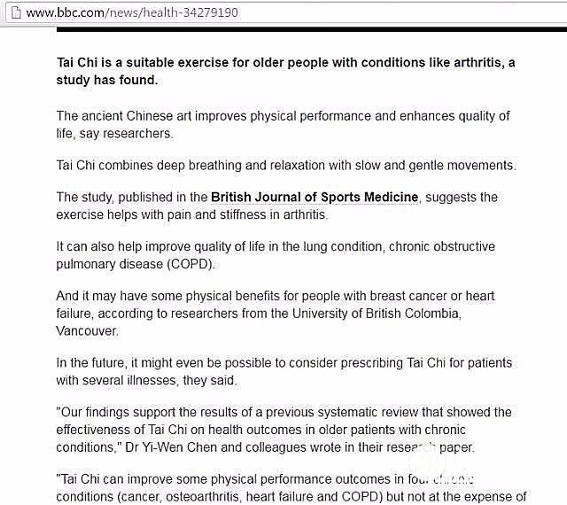 世界著名的BBC更是太极也许可以当作治疗疾病的药方!本文引用的研究来源于加拿大英属哥伦比亚大学的、发表于英国运动医学杂志的最新研究:太极有助于减轻关节疼痛和关节僵硬,同时它能帮助提高肺病患者(比如慢性阻塞性肺病患者)的生活质量。