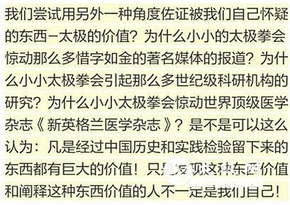 当我们的太极也被视为宝贝的时候...... (作者:刚子医生) 本篇关于太极的文章,我们试着从完全不同的角度即欧美的角度看待我们自己的东西,希冀在大家了解太极好处的同时多一些些省思。相信很多很多朋友不屑太极拳、甚至有人会认为太极非但没有好处,反而有害于膝关节健康,还有些所谓打假学者,臆断太极拳毫无用处,破烂东西。可正是那些常常被我们视为“破烂东西、不值一提“的具有中国文化的治病方法及锻炼方法,却屡屡被西方视为宝贝而登大雅之堂!此言到底虚不虚,请大家随我们来浏览重量级原版外国期刊杂志!