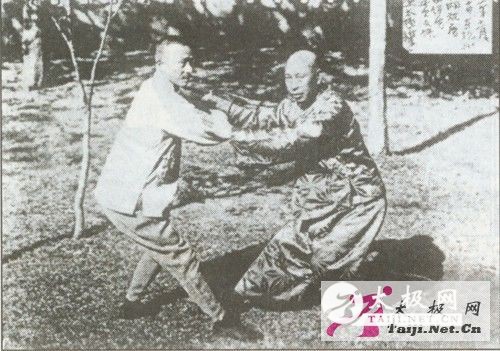 民国十八年秋(1929年),杨澄甫先生为浙江国术馆教务长,余常与之推手。某次比演双按,杨老师顺势一扑,其手指并未沾着余之衣襟,而余胸中隐隐作痛移时。