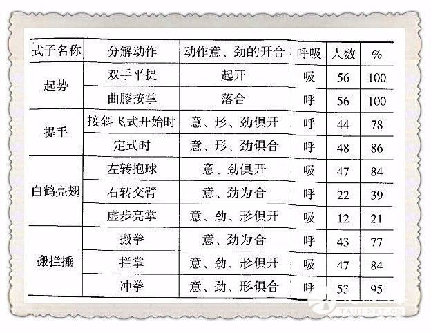 本来,呼吸是极其自然的生理活动,由于一两百年前的拳家们没有运动生理学的理论知识,才用开合的某一特定意义与呼吸联系起来。而开、合在不同文句中,意义又不尽相同,人们可根据自己不同的认识去借用开、合,于是历来都有人把太极拳运动中关于呼吸的理论搞糊涂了。 事实上在运动实践过程中,有一定体会的人所作的拳势呼吸,大抵都是相同的:下面是随机取样调查有3年以上练拳经验的太极爱好者56人,其中男22人,女34人。用腹式呼吸者9人,占16%;自然呼吸者47人,占84%。具体调查了“起势”、 “提手”、 “白鹤亮翅”、 ‘‘搬拦捶’’等44"式子运动过程的呼吸情况,结果如下表: