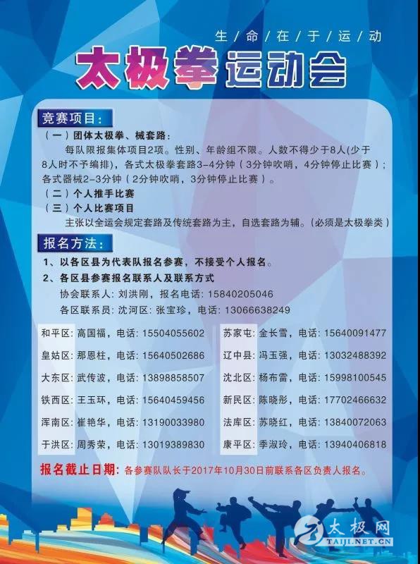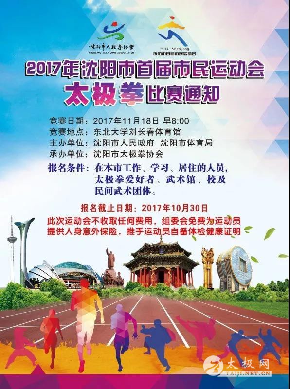 竞赛规程 一、主办单位 沈阳市人民政府 沈阳市体育局 二、承办单位 沈阳市太极拳协会 三、竞赛日期 2017年11月18日 四、竞赛地点 东北大学刘长春体育馆 五、参赛对象 1.在本市工作、学习、居住的人员,太极拳爱好者、武术馆、校及民间武术团体。 2.身体健康,无不适合参加比赛的身体疾病。 3.凡属专业运动队在编的一、二线运动员、教练员不得参加在训项目的比赛(包括职业俱乐部运动员、教练员);沈阳体育学院、竞体校在编学生不得参加比赛。 4.安全保障:比赛执行单位为参赛运动员统一办理人身意外伤害保险。 六、竞赛项目 (一)国家规定的太极拳、械套路 1、24式太极拳;2、42式太极拳;3、陈式太极拳;4、杨式太极拳;5、吴式太极拳;6、武式太极拳;7、孙式太极拳;8、32式太极剑;9、42式太极剑; (二)传统太极拳、械套路: 10、陈式;11、杨式;12、吴式;13、武式;14、孙式;15、赵堡;16、混元太极;17、其他各式太极拳套路 (三)器械: 18、太极刀;19、太极剑;20、其他太极器械 (四)推手项目: 分定步推手与活步推手两种,执行国家推手新规则,参赛选手按年龄及体重级别分组(60公斤以下级,60公斤至70公斤级,70至80公斤级,80公斤以上) 七、竞赛年龄组别 (一)套路团体赛组:6周岁至65周岁。 (二)套路个人赛组: 少儿组(A组):6周岁至17周岁。 中青组(B组):18周岁至59周岁。 老年组(D组):60周岁以上。 (三)推手竞赛组: 中青年组(A组):40周岁以下。 中年组(B组):40周岁至60周岁。 老年组(C组):60周岁以上。 八、竞赛办法 (一)遵循中国武术协会审定的《传统武术套路竞赛规则》(2012)及有关补充规定。 (二)24式太极拳采用原国家体委编印的《24式太极拳》套路。 (三)42式、陈、杨、吴、孙、武式太极拳竞赛套路,42式太极剑分别采用原国家体委武术研究院编印的《太极拳竞赛套路》、《四十二式太极拳竞赛套路》、1991年编印的《太极剑竞赛套路》和1996年编印的《武式太极拳竞赛套路》。 (四)套路时间规定:各式太极拳3-4分钟(3分钟吹哨,4分钟停止比赛);各式器械2-3分钟(2分钟吹哨,3分钟停止比赛)。 (五)定步推手执行国家规定的《推手新规则》 (六)活步推手执行沈阳市太极拳协会规定的《活步推手》比赛规则。 九、参赛办法 (一)本次比赛以集体套路为主,旨在全民健身,全部赛事不收取报名费及项目评审费。 (二)参赛人员为沈阳市民以及在沈阳生活和工作的人员。 (三)参赛者应身体和精神健康,有经常性参加太极拳锻炼或训练的基础。参赛者要根据自己的身体状况和能力,选择参赛项目。选手在参赛过程中一旦感觉身体不适,应立即中止比赛,请求工作人员帮助。 (四)为了保障参赛运动员的人身安全并确保比赛的顺利进行,运动员的人身意外伤害保险由大赛組委会统一免费提供,参赛运动员签署免责声明,推手项目运动员需办理体检证明。出现意外伤害比赛主办方及承办方不负任何责任。 (五)每队限报集体项目2项。性别、年龄组不限。人数不得少于8人(少于8人时不予编排)。内容以单项拳种拳术或单项拳种器械为主要体现形式。 (六)个人项目每人仅限报1项。(包含太极拳和太极器械项目) 十、报名办法 请各区县参赛队务必于2017年10月30日前将报名表发送至邮箱:gang980422@163.com |